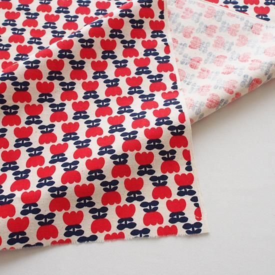 赤いチューリップのようなお花にブルーの葉がキレイに並んだレトロ感タップリのかわいいファブリックです。