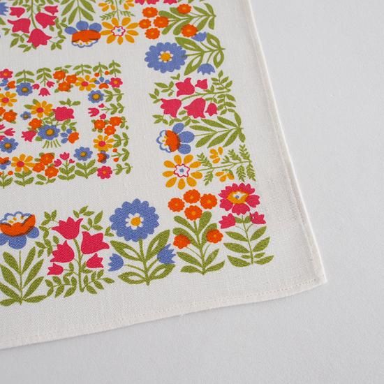 キナリのコットン地に美しい北欧の花が自然に色鮮やかに咲いています。