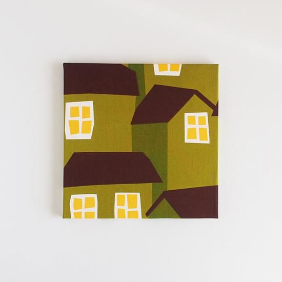マリメッコの人気若手デザイナー、アイノ-マイヤ・メトソラによるデザインのMokki(コテージ)/グリーンのファブリックパネルです。
