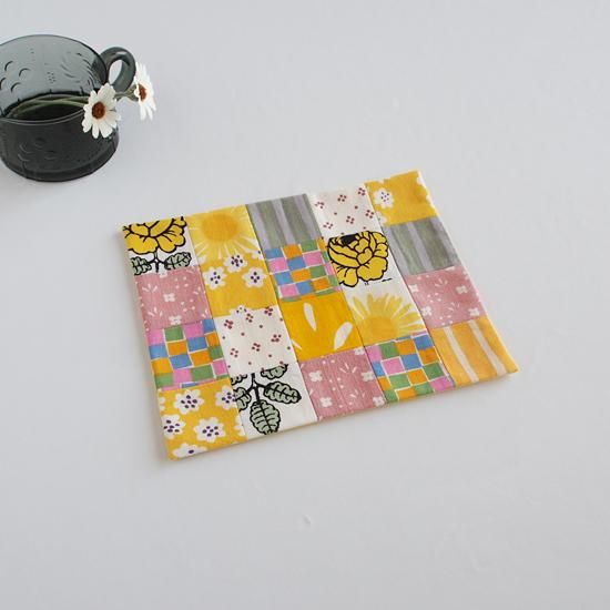 マリメッコのヴィンテージ、廃盤布などを使い20枚のピースを合わせて作った16cm×20cmのパッチワークマットです。
