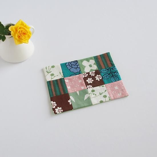 マリメッコのヴィンテージ布、廃盤布を使い12枚のピースを合わせて作った12cm×16cmのパッチワークマットです。
