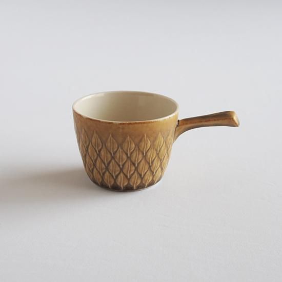 規則正しく並ぶ葉にしっとりしたカフェオレ色の釉薬が濃淡に絡んで奥深い佇まいがあります。