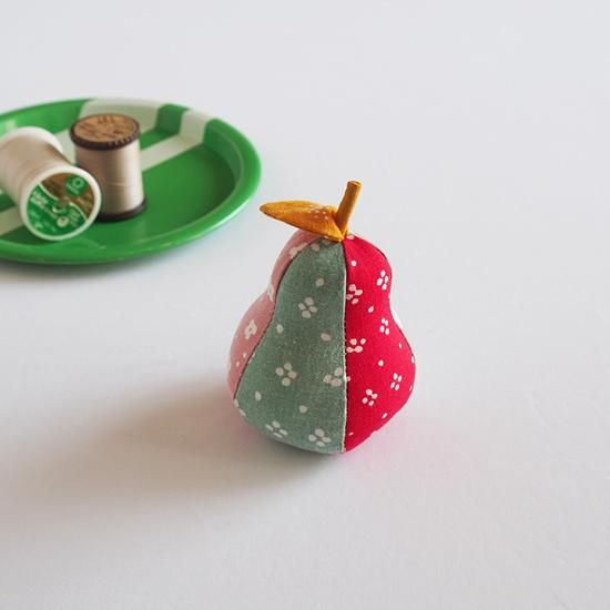 マリメッコのヴィンテージ布をつないで作った洋ナシのピンクッションです。