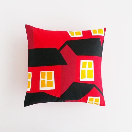 マリメッコの人気若手デザイナー、アイノ-マイヤ・メトソラによるデザインのMokki(コテージ)/レッドで作ったクッションカバーです。