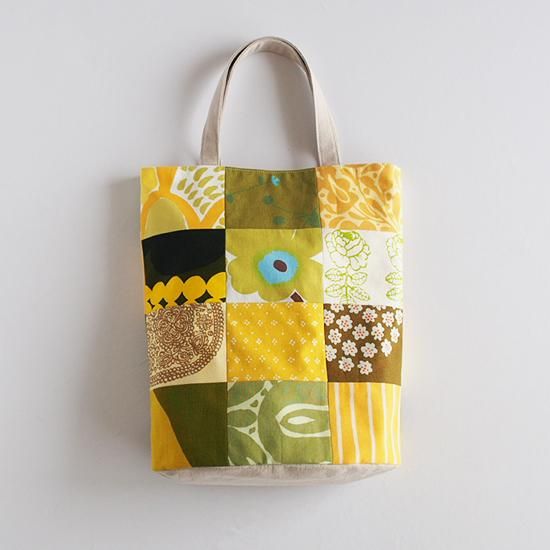 マリメッコのヴィンテージ布、廃盤布を使ってパッチワーク仕立てで作ったトートバッグです。