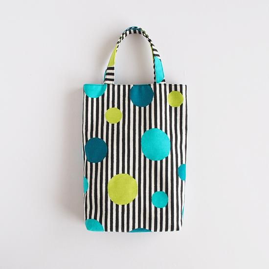 ハンドペイントのようなゆるめのブラックストライプに、大小のブルーとグリーンのドット柄が爽やかで北欧テイスト漂うトートバッグです。