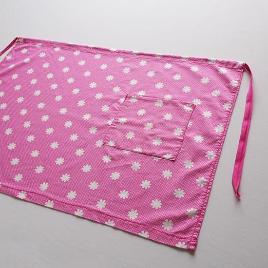ピンク色に散りばめられた白い花のフレームが可愛らしいコットン布地の手作りエプロンです。