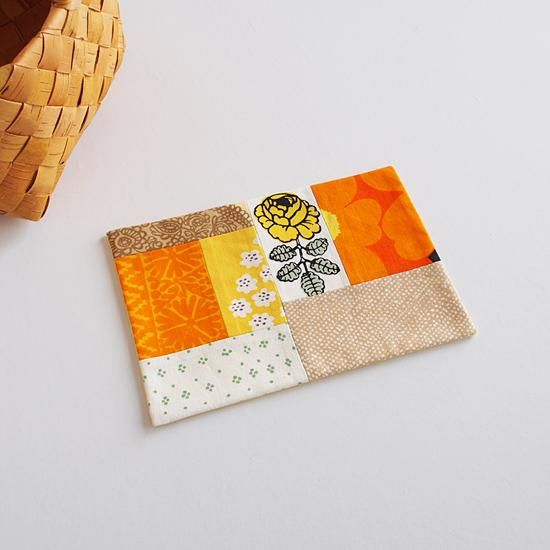 マリメッコのヴィンテージ布、廃盤布を使ってパッチワークのようにカットピースを1枚の布につなげ合わせた15cm×22cmのフリーマットです。