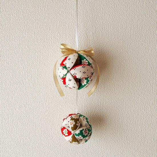 江戸時代から始まったという吊るし雛(つるしびな)のなかでも豪華な七宝毬(しちはうまり)を参考にクリスマス、お正月に似合うオーナメントを作りました。