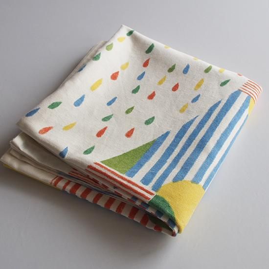 全体に川の流れを連想しますが、クレヨンで描いたようなしずくやライン、色使いなど一つ一つに表情があり、素材のソフトキャンバスとの相性も良い素敵なクロスです。