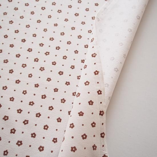 白地にハンドペイントのような茶色のドットと可愛らしい小花が交互に整列したパターンは、柄が小さく小物などの制作におすすめです。