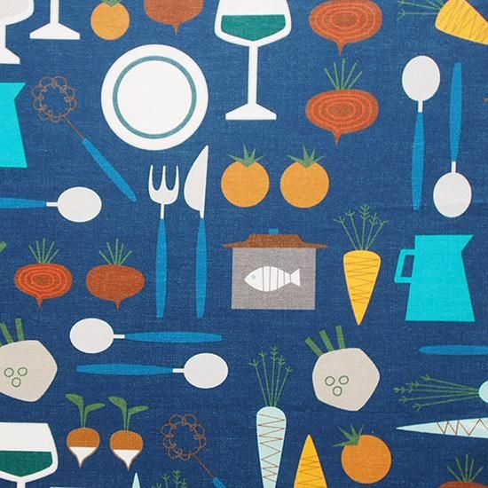 Dinnerという名前のパターンは、キッチンのお道具やテーブルウエア、お野菜などがポップなタッチでカラフルに描かれています。