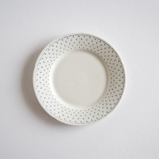 デザインは「Swedish Grace」の特徴である素地に刻まれた麦の模様上に、 Bla Vinge(青い羽)のプリントが散りばめられ、縁周りには5か所にフリルのようなくぼみを入れた清楚な雰囲気のプレートです。