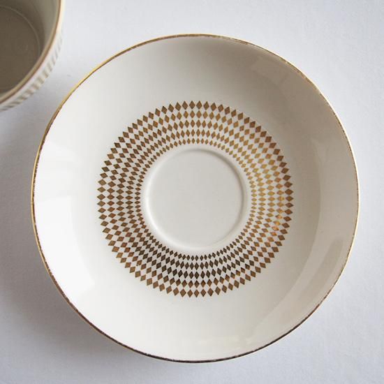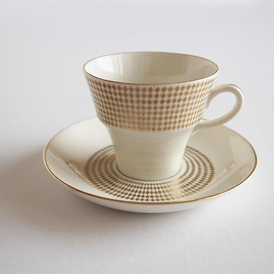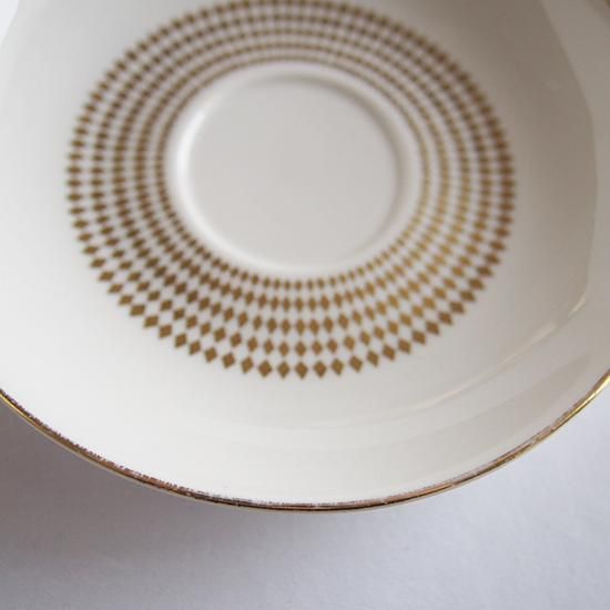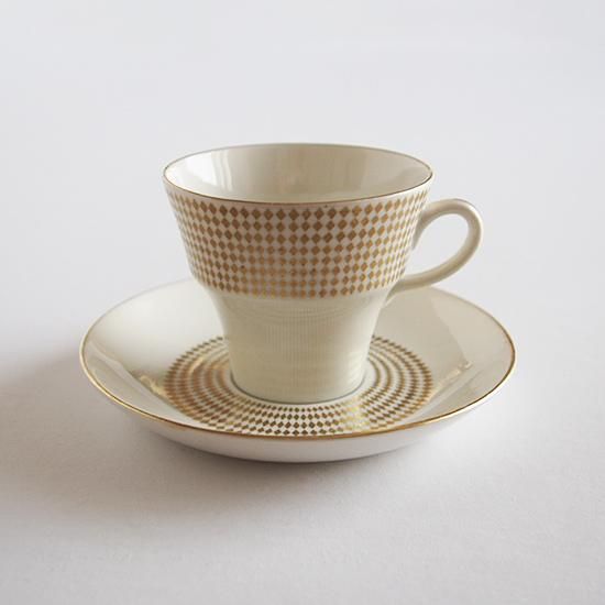 ダイヤ模様の金彩が外側に向かって大きくなっていく、動きが感じられる華やいだ雰囲気の上品なカップ&ソーサーです。