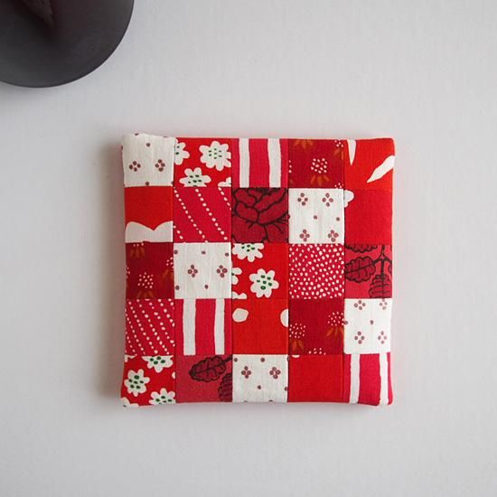 小さなカットピースをパッチワークのように1枚につなげた15センチ四方のポットマットです。