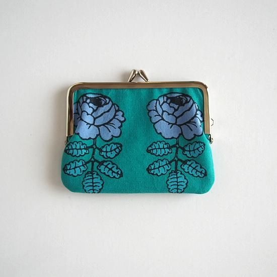 マリメッコを代表するデザイナー、Maija Isola(マイヤ・イソラ)がデザインしたウェディングローズ柄のパターン、Vihkiruusu(ヴィヒキルース)のグリーンのヴィンテージ布地を使い作ったガマ口ポーチです。