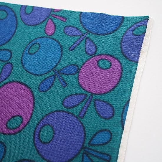 ポップで大粒のベリーのようなモチーフがブルー、グリーン、パープルのニュアンスカラーにまとめられた落ち着いた一枚です。