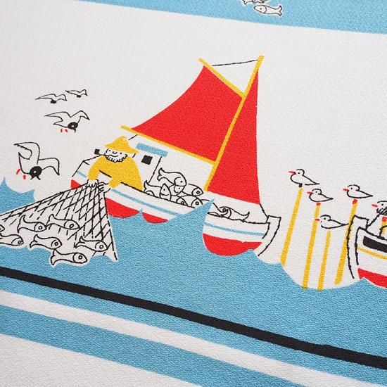 清々しい色使いに、漁をしている漁師さんや魚、鳥たちがほのぼのと可愛らしく描かれています。