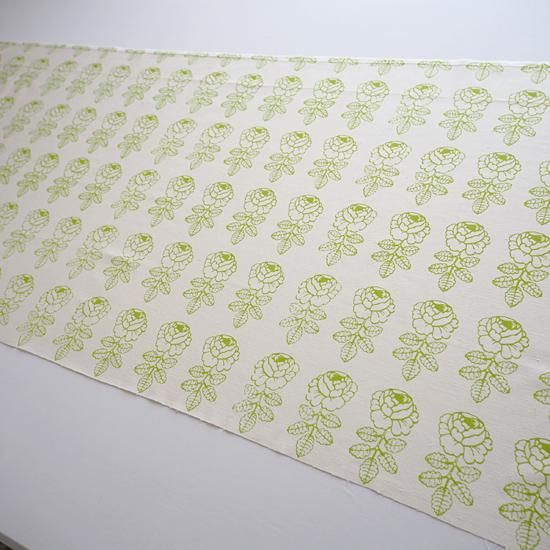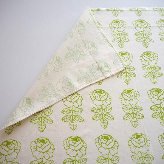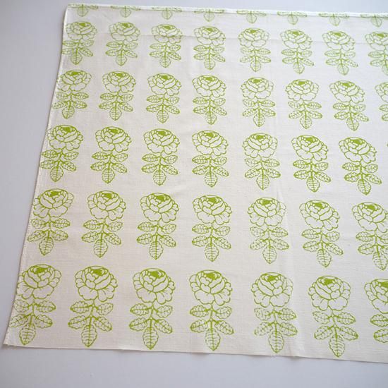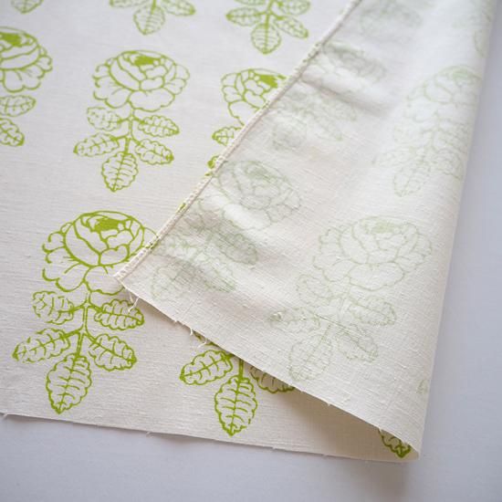 生成りの地にライトグリーンのローズの色合いがやさしく爽やかなテキスタイルです。
