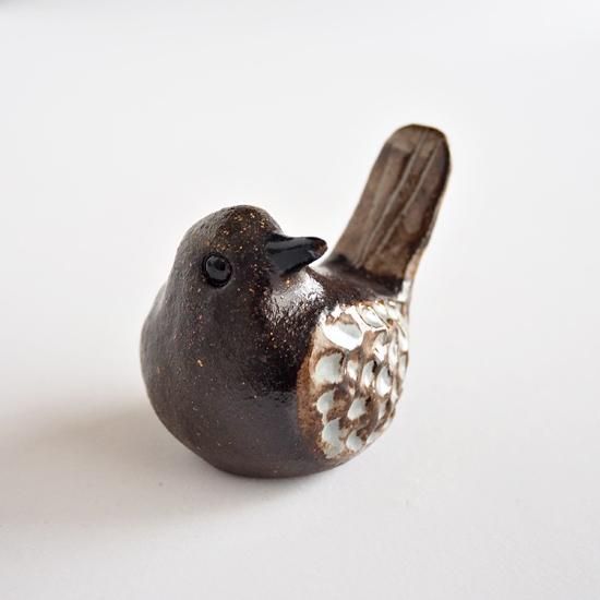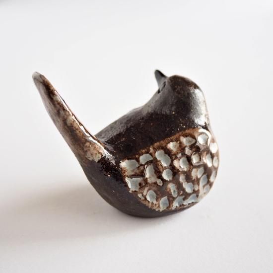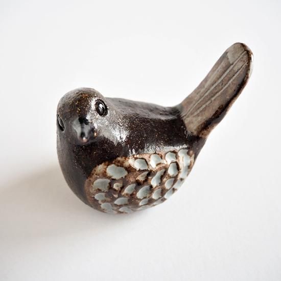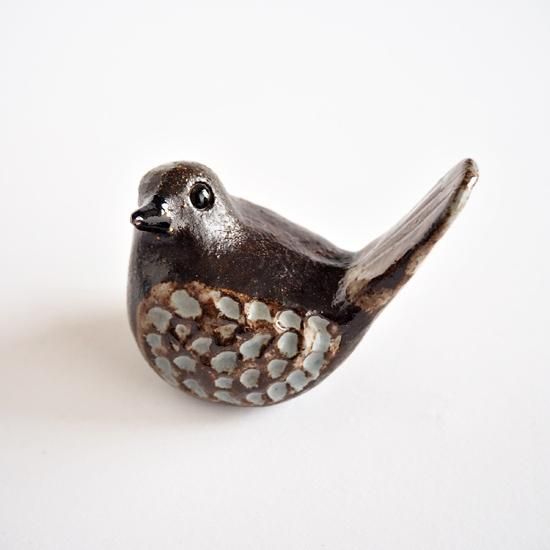 焦げ茶色の深い色合いにころんとした胴体、ブルーグリーンの凹凸のある羽根とつぶらな瞳が愛らしい小鳥は、素朴な雰囲気で不思議と癒されます。