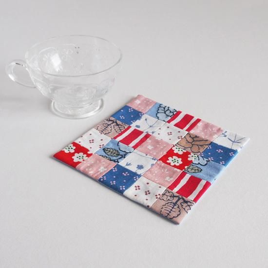 パッチワークの表布と無地の裏布のみの軽い仕様はコースターやマット、目隠しカバーなどににお使いいただけます。