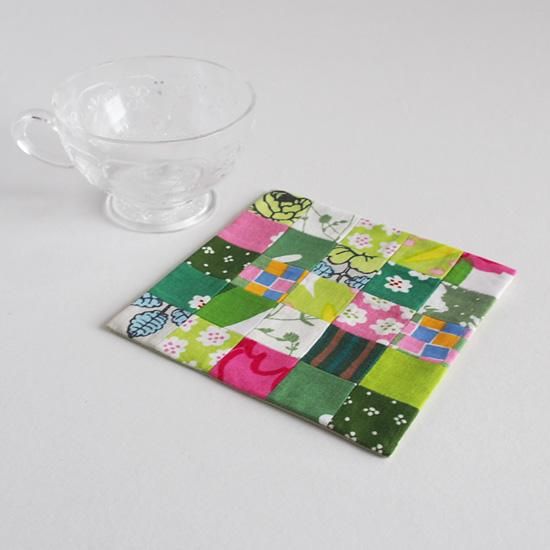 パッチワークの表布と無地の裏布のみの軽い仕様はコースターやマット、目隠しカバーなどににお使いいただけます。