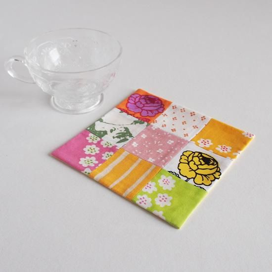 パッチワークの表布と無地の裏布のみの軽い仕様はコースターやマット、目隠しカバーなどににお使いいただけます。